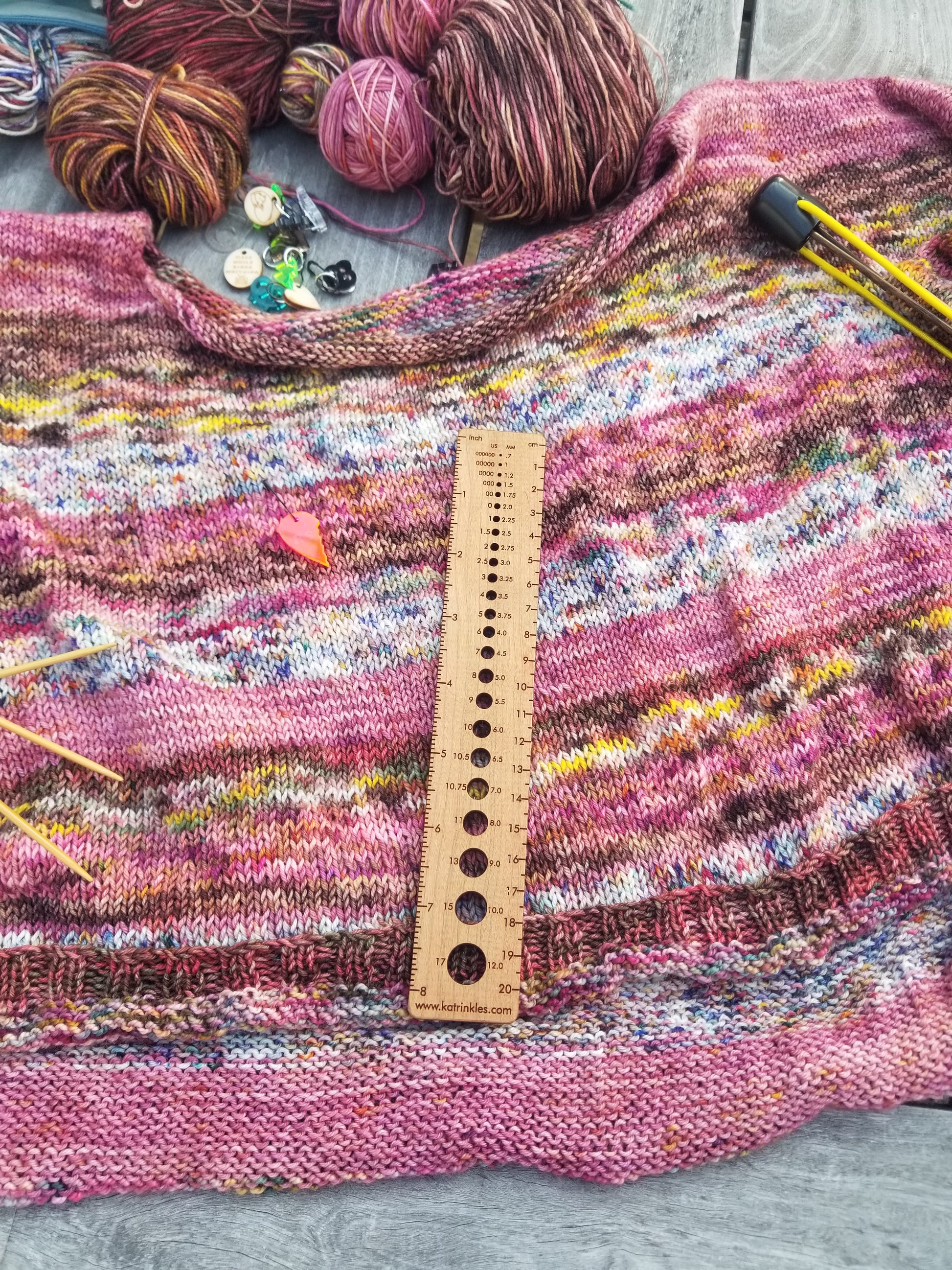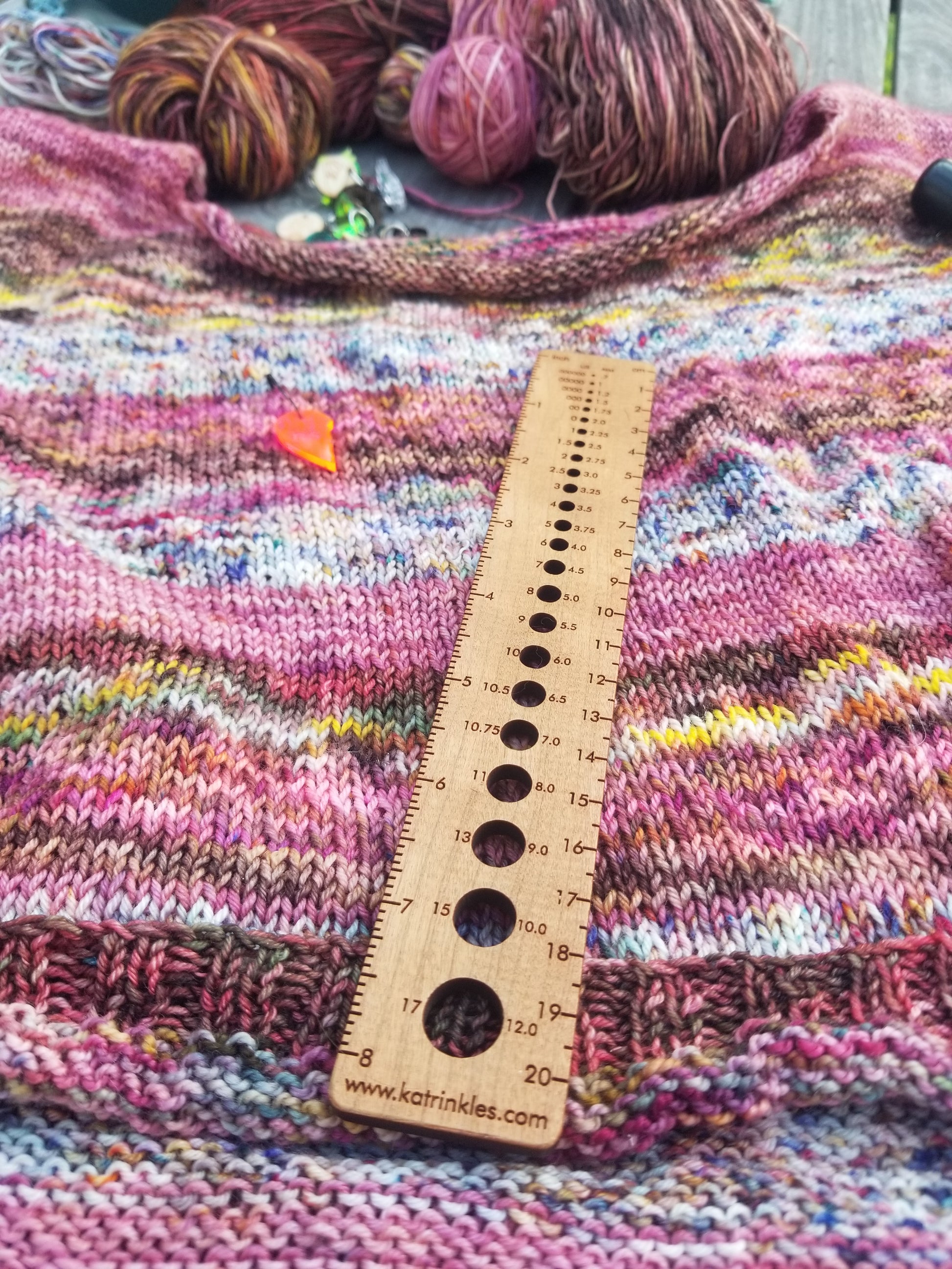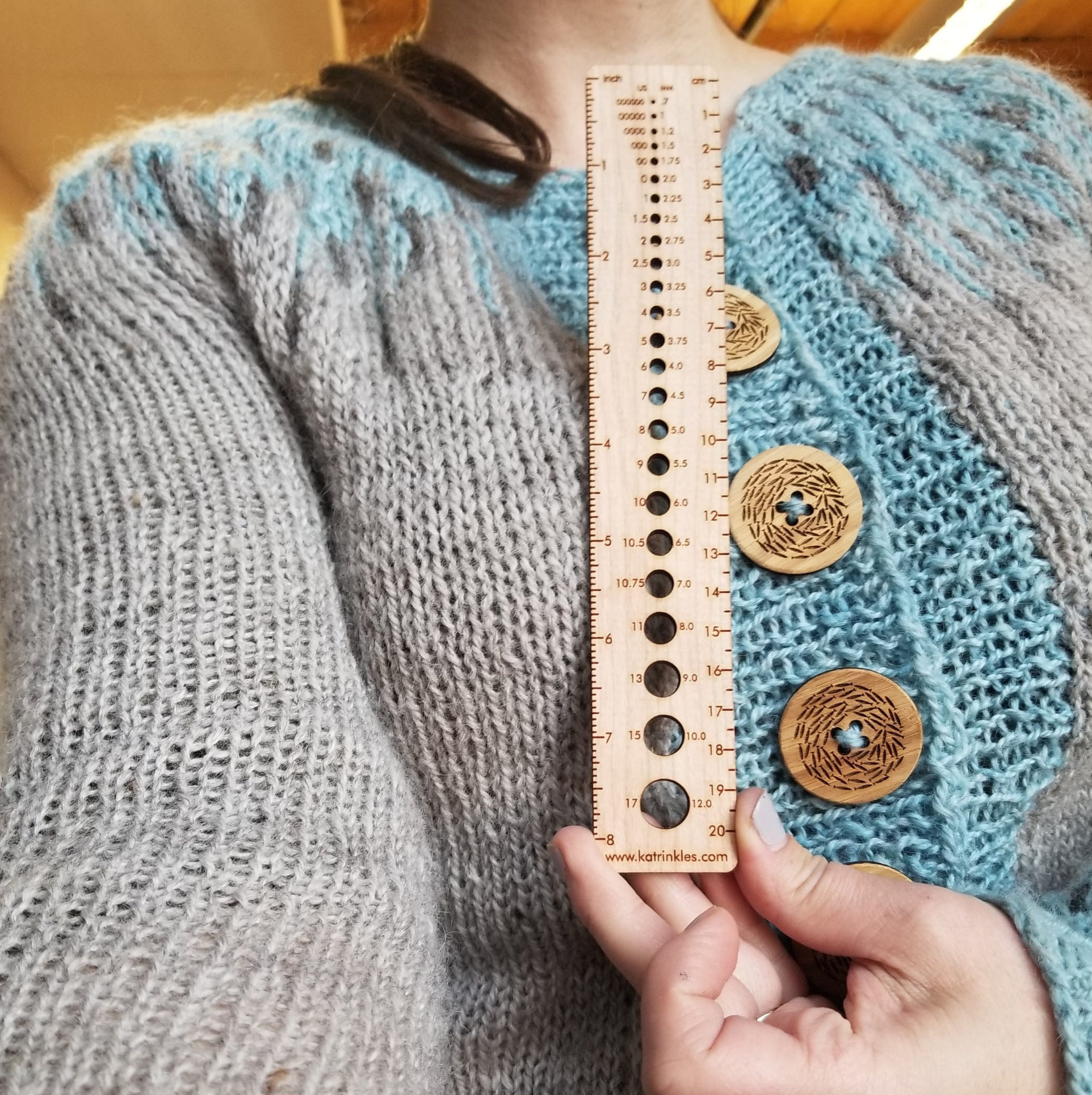 This handy 8 inch straight ruler with knitting needle gauge is the perfect tool to toss inside your project bag. Holes for knitting needle sizes from 000000 to 17 are also clearly marked with metric sizes.