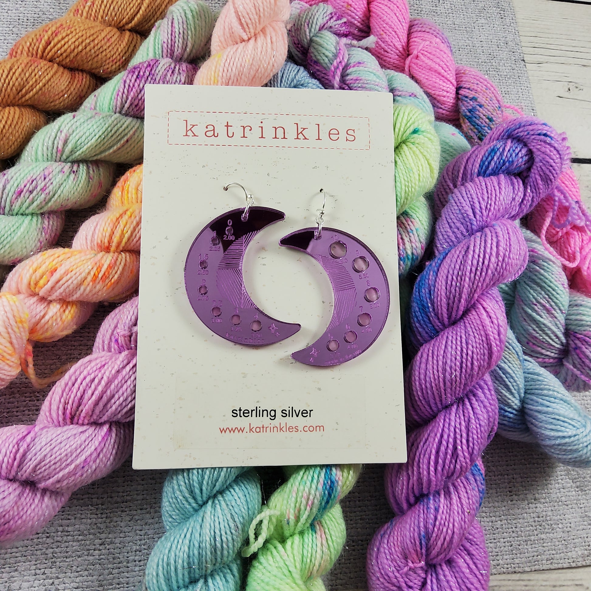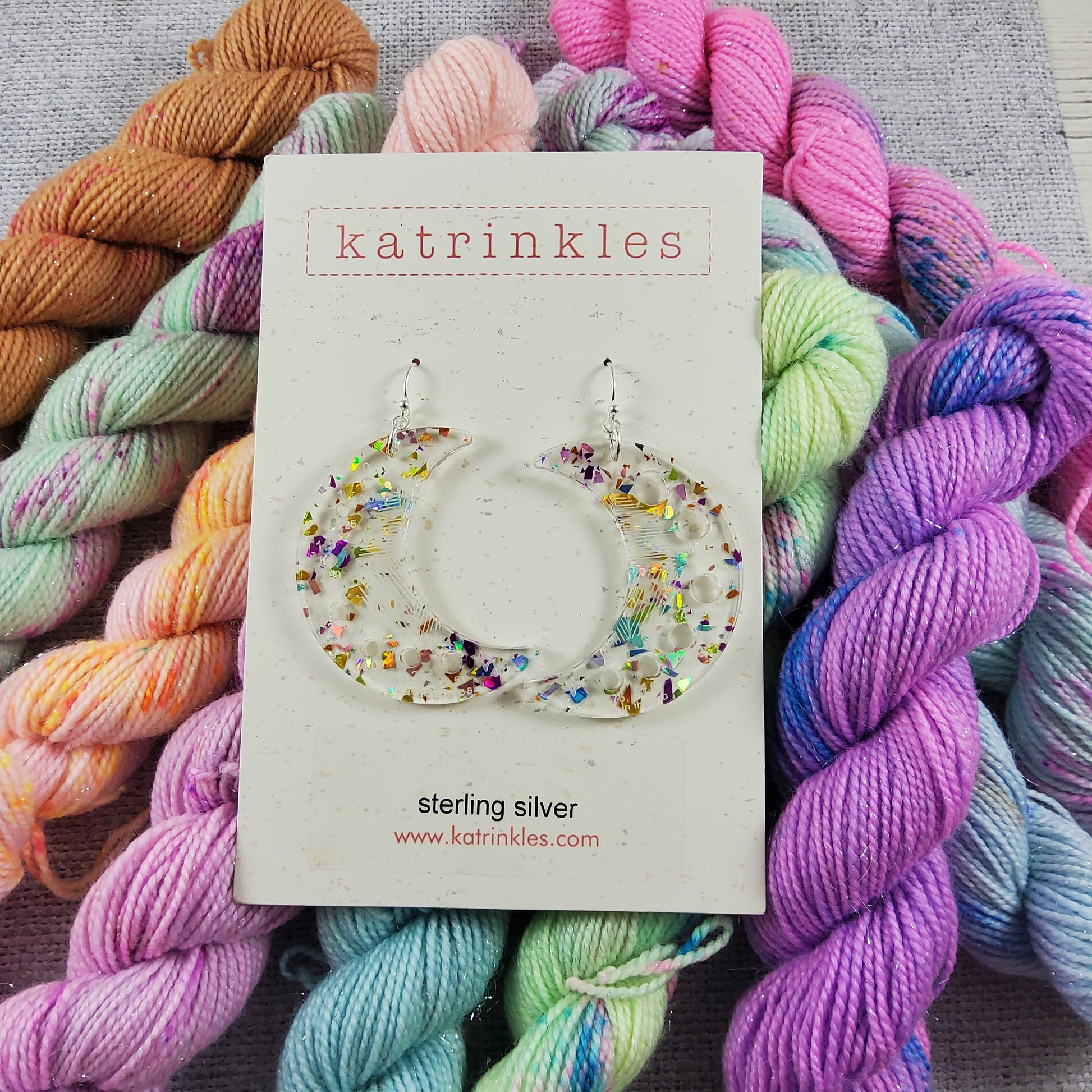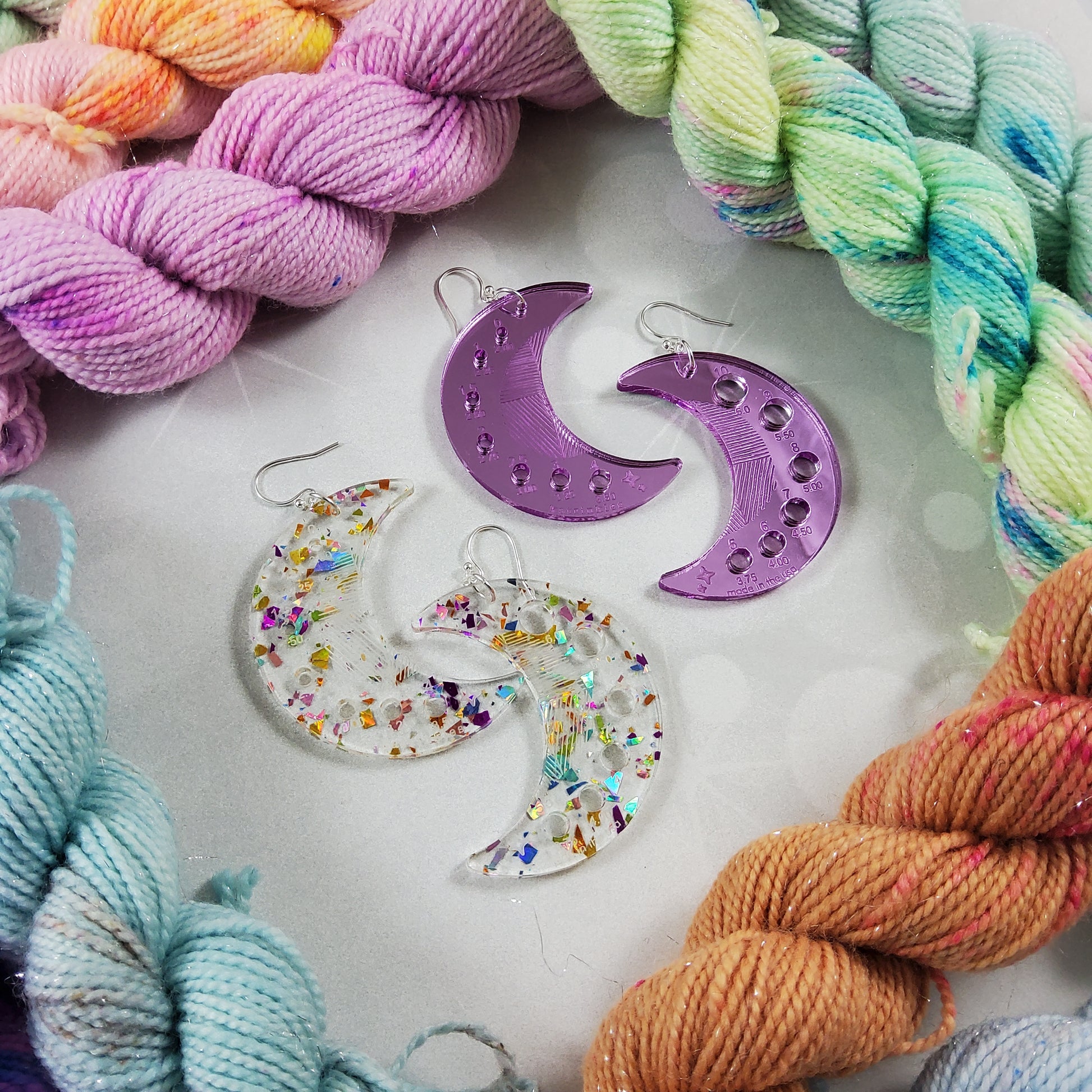Our popular crescent moon shaped acrylic earrings, available for a limited in two special new colors - Princess Flake Glitter and Lavender Mirror.