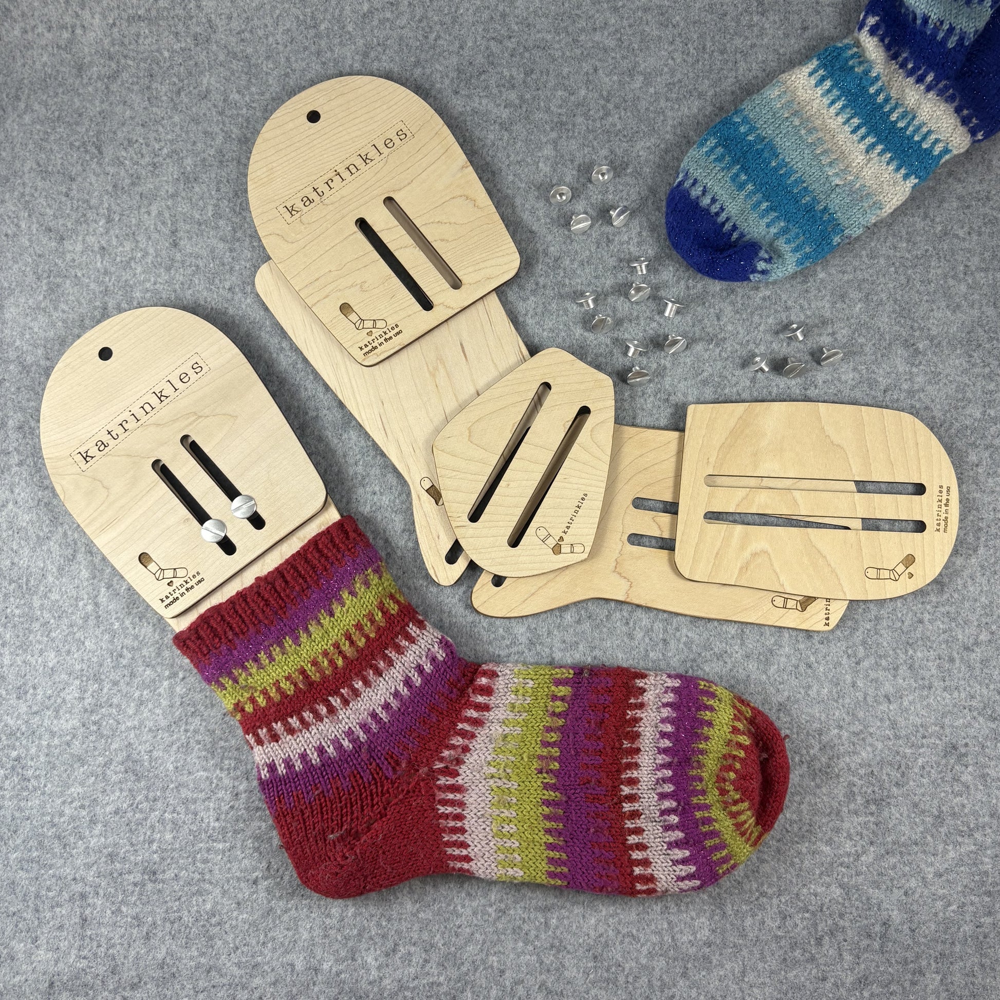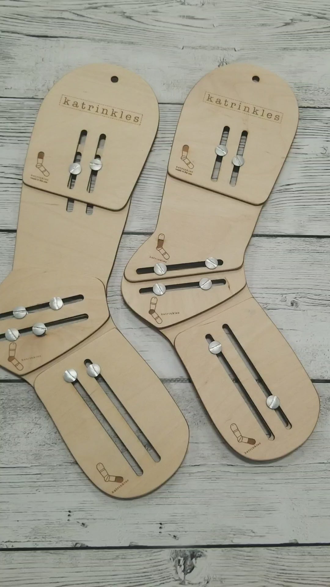 Our updated design makes our adjustable sock blockers better than ever. We make them with slots instead of fixed holes, so that once the two-part screws are assembled the sock blocker pieces can slide to adjust. This means you can get more "in between" sizes, since you're not limited to assembling them where the holes meet. You no longer have to take them all the way apart to adjust for blocking different pairs of socks.