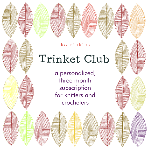 Our monthly package subscription designed with the knitter, crocheter and general crafter in mind is back with a whole new look for Fall 2025. If you've ordered Trinket Club in the past, you'll be delighted to discover a whole new season's worth of fresh, original designs.