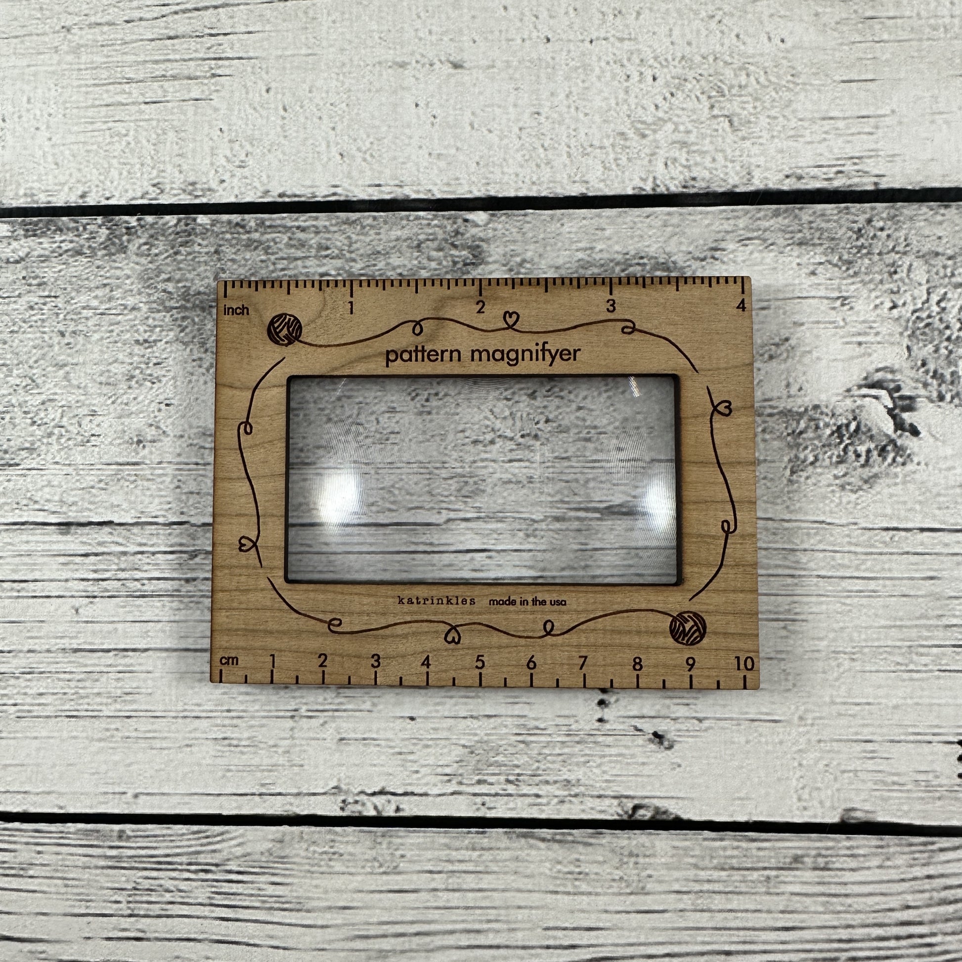 When you're in the middle of stitching a row, it can be awkward to lean over to peer over at the next step in your pattern...and sometimes the print is just too small to start with! The Katrinkles Pattern Magnifyer Tool provides a simple solution for hard to read pattern instructions, with a durable, scratch-resistant plastic lens that magnifies words and enlarges illustrations. The sturdy hardwood frame protects the lens while doubling as a ruler in both centimeters and inches to help with accurate measurements.