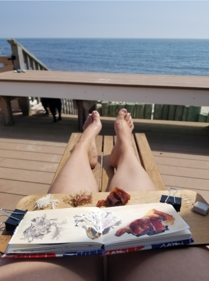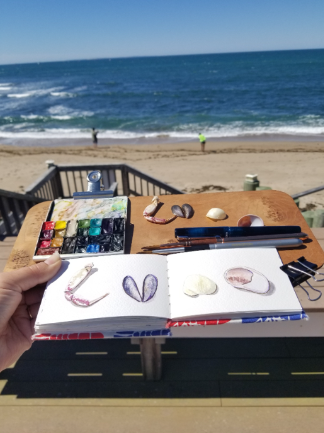 This flat easel has a notch at the bottom edge that can be used to attach a journal. Lift the leaves of your journal away from the covers and insert them into the slot. Then let them down over the top of the board and clip the pages down with the binding and covers sitting underneath. This attaches the book securely to the easel and leaves room at the top of the board for supplies. Alternately, tape or clip a small painting onto the board itself to use the surface as a small lap board.