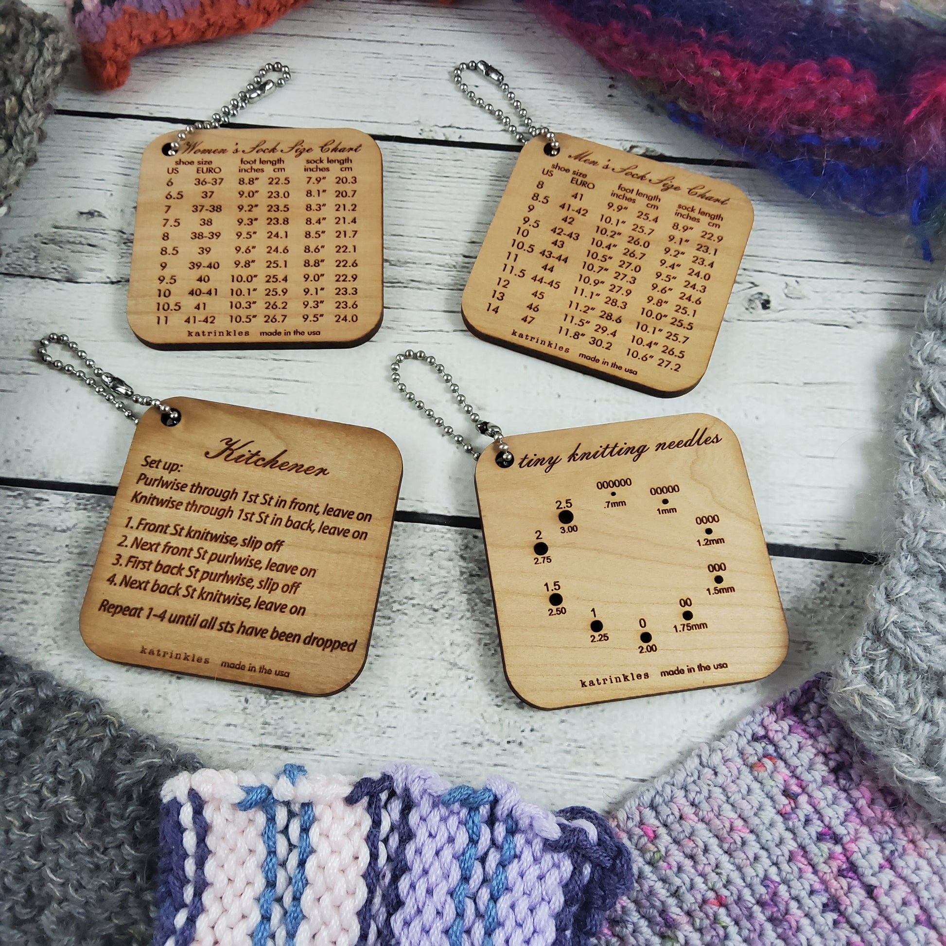 We put together this selection of mini tools specifically to help you knit socks. Including one Kitchener instruction tool, one gauge for sock size needles, and five sock size guides covering socks from toddlers to adults, you'll be ready to tackle any sock making project with this tool set!