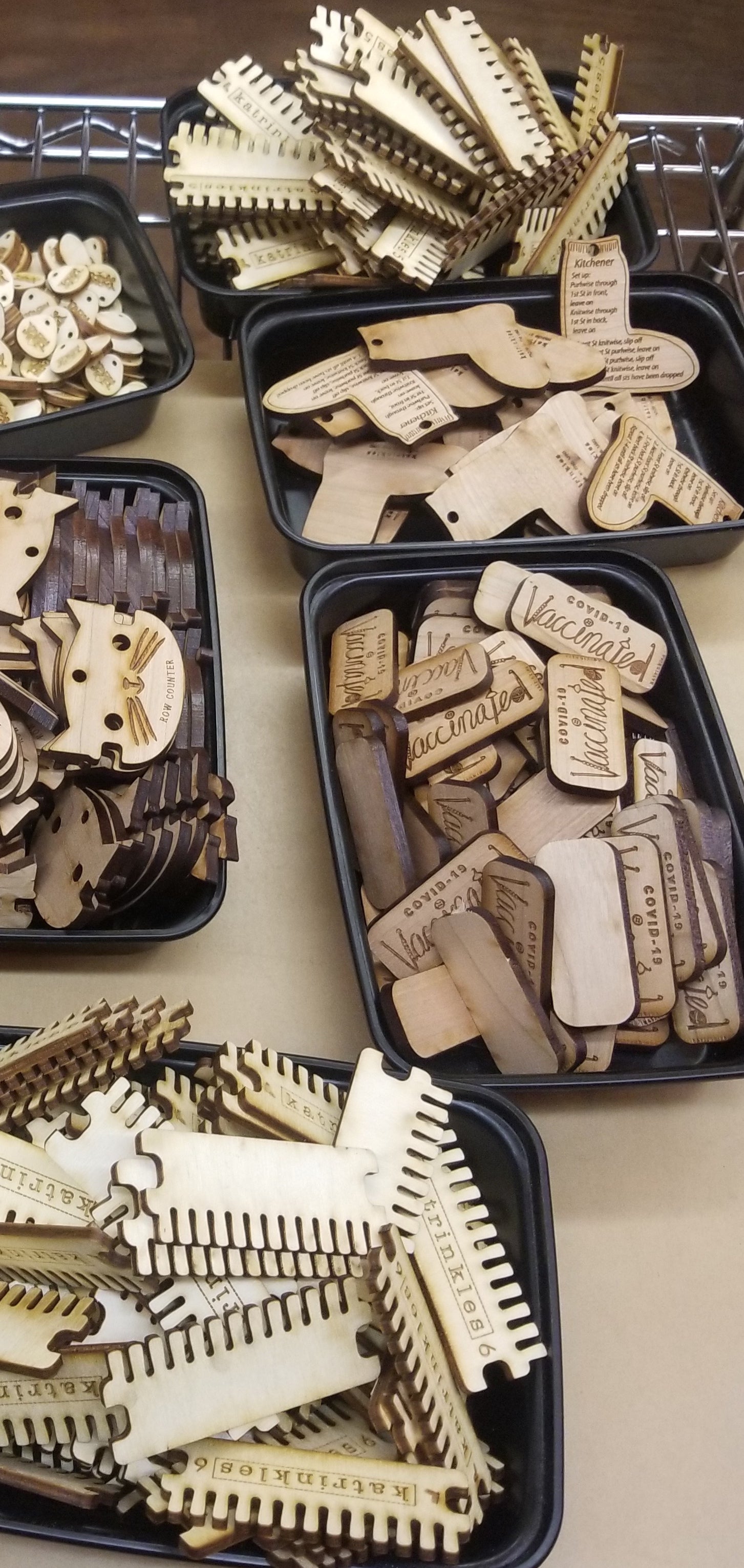 Vi prøver å resirkulere og gjenbruke våre avfallsmaterialer der det er mulig. Dette inkluderer å designe skjæringen vår for å få mest mulig ut av hvert stykke tre vi bruker. Eventuelle interessante former som kommer ut av lasermaskinene våre som vi ikke kan bruke til å kutte andre produkter, doneres til Resources for RI Education . Våre brennbare vedrester distribueres til naboer for oppvarming av hjemmet og til lokale restauranter som bruker vedfyring til matlaging. Vi sender våre akrylrester til et anlegg for resirkulering. Ta kontakt for mer informasjon hvis du er interessert i kirsebærrester eller treformer.