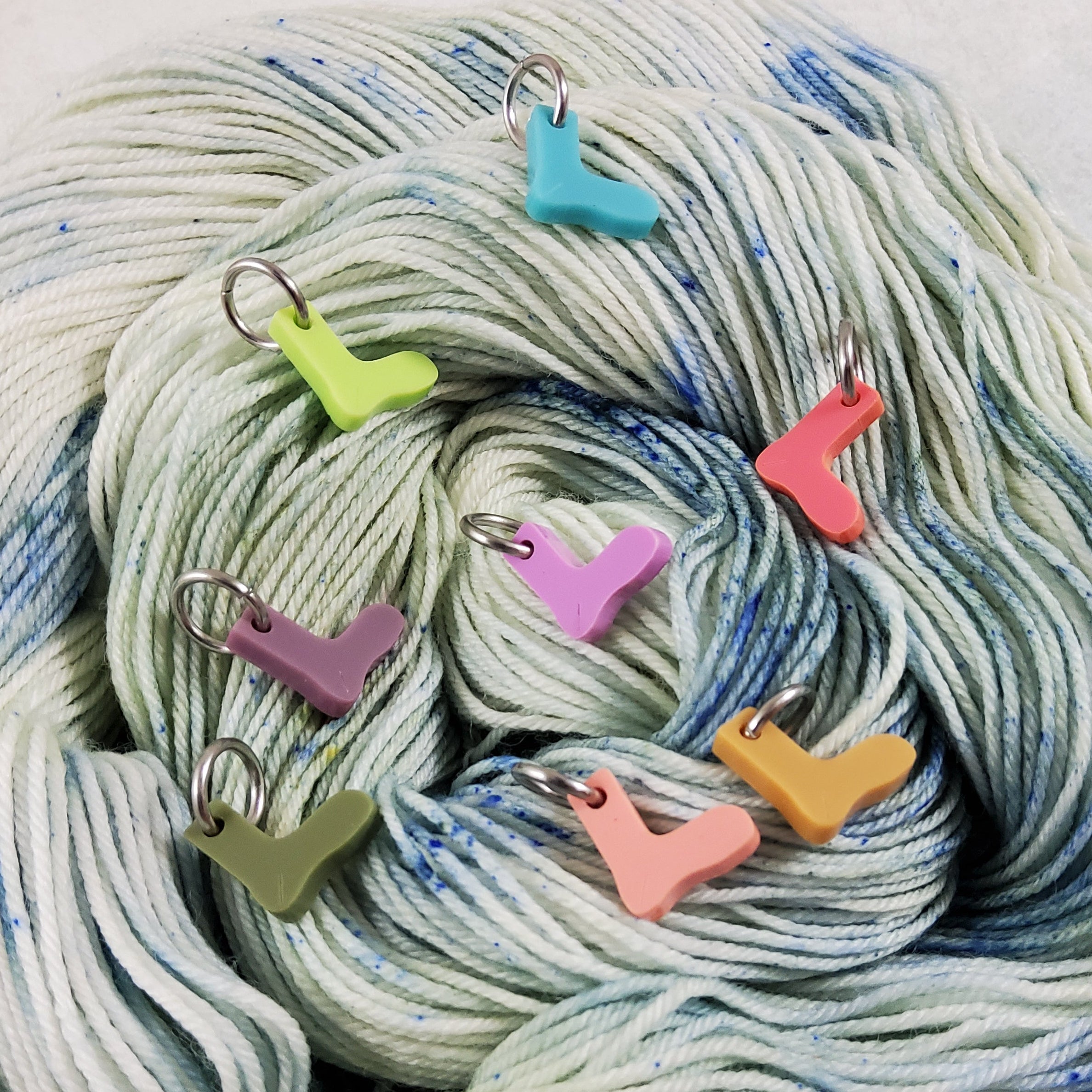 What's cuter than a pair of socks? This set of eight tiny socks, of course! Cut from a colorful mix of acrylics, these diminutive stitch markers do a big job in getting sock knitting projects done in style.
