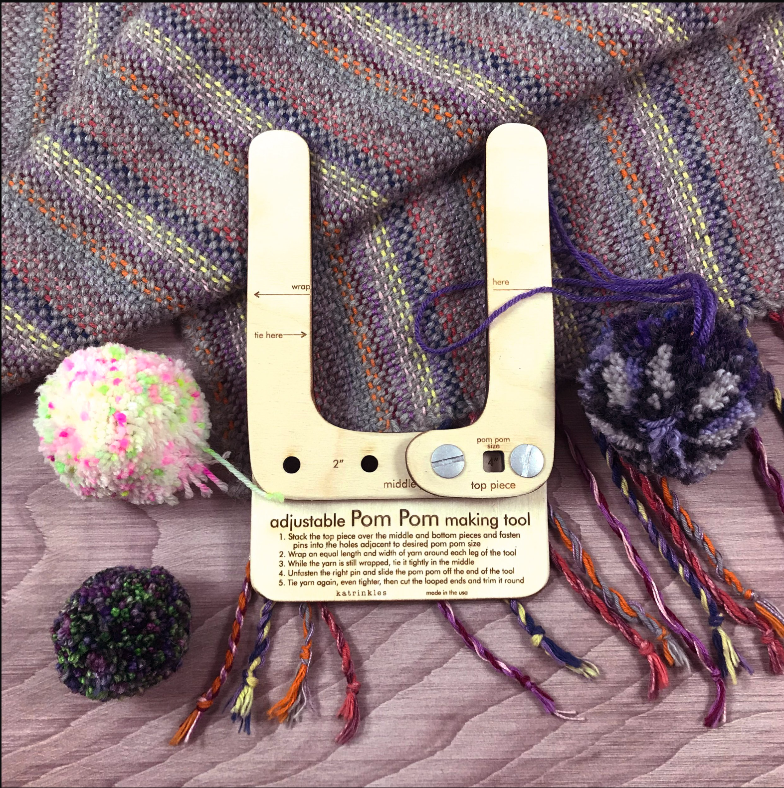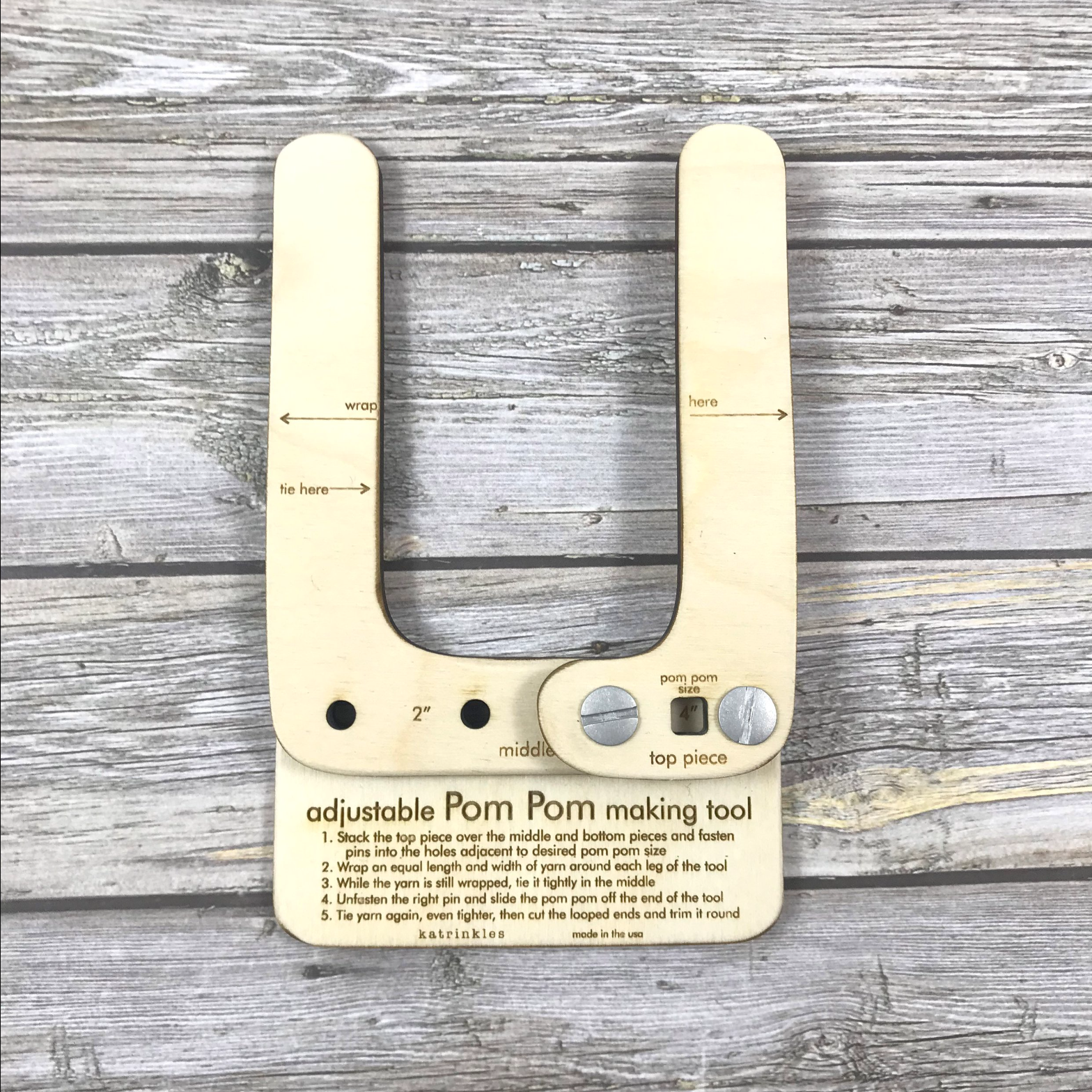 This tool is adjustable and makes sizes 2”, 3”, and 4” pom poms.