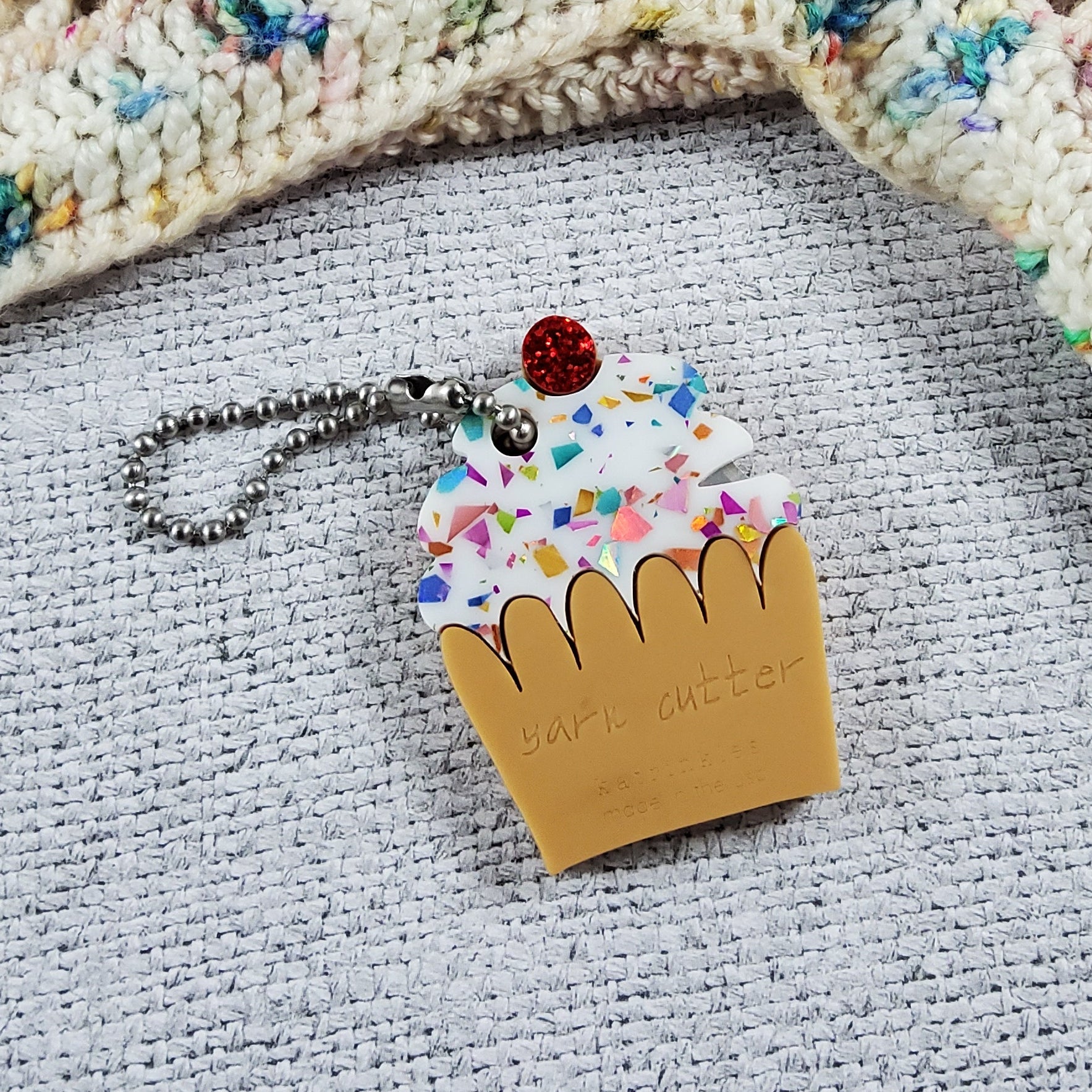It's not a party without cake! This scrumptious new knitting tool looks good enough to eat, though we recommend that you use it to take a bite out of overlong bits of thread and yarn. A handy blade is tucked safely in a fold of the cupcake's towering confetti frosting. And the cherry on top? Well, it's a cherry on top! It's a fun birthday gift, and perfect for any celebration. Loop this tasty treat onto your project bag and take the party with you wherever you go.