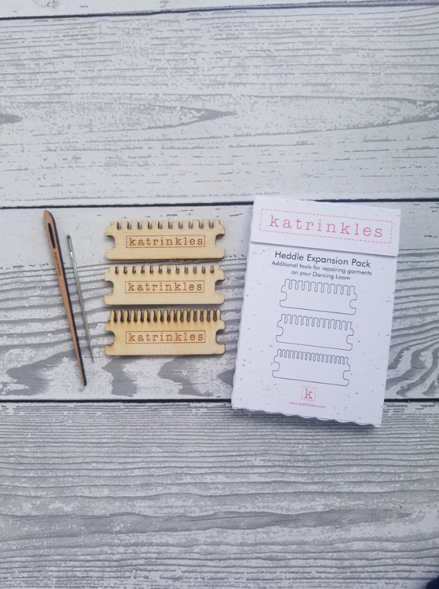 The Heddle Expansion Pack with three larger heddles with three teeth sizes allows the Smaller Darning Loom to mend larger holes in a variety of yarn thicknesses.