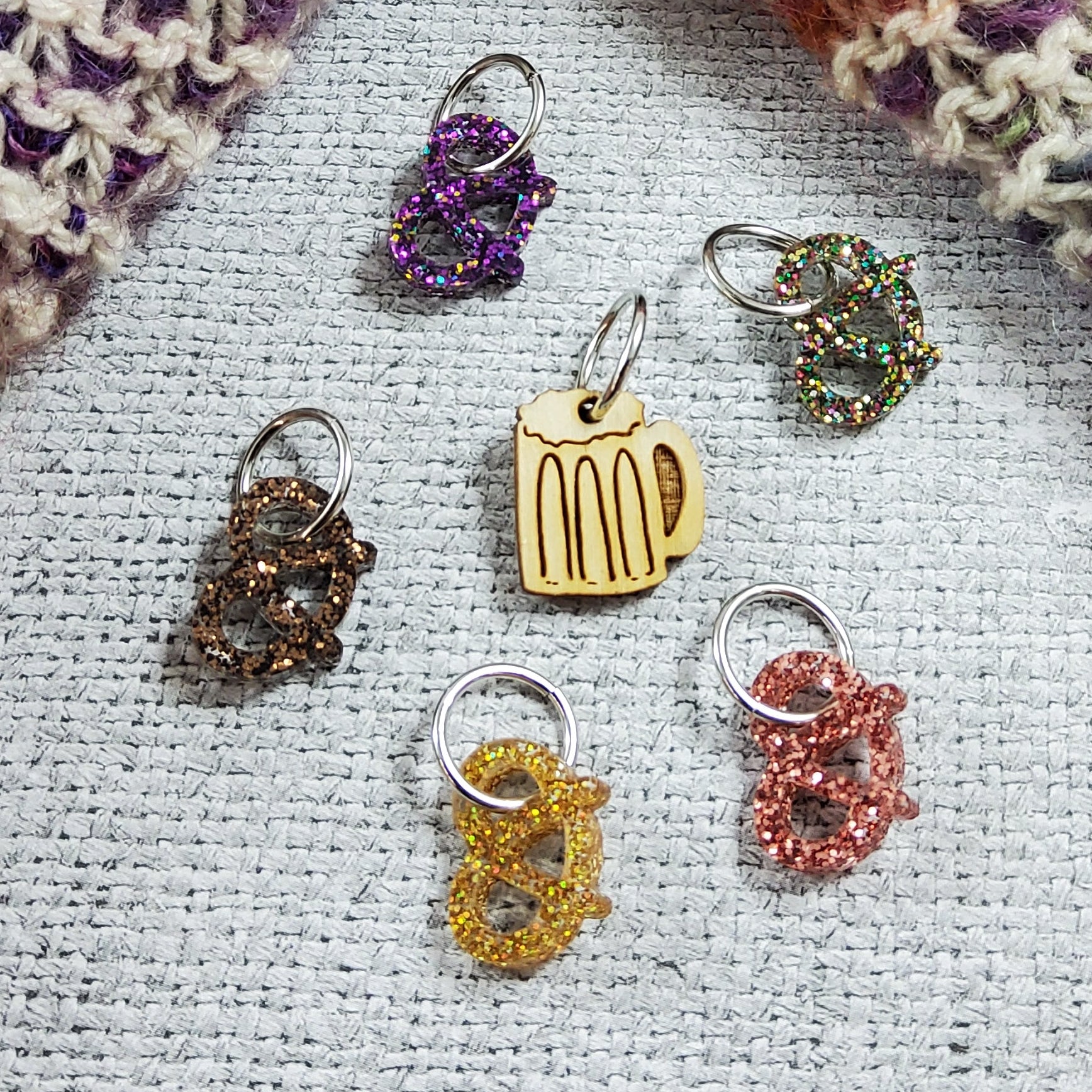 Every knitting project requires a few essentials: yarn, needles, a good pattern...and snacks. Go ahead and binge on these cute stitch markers in the shape of tasty pretzels! In a mix of glittery acrylic colors, this fun stitch marker set adds "salty" attitude to hand knits and satisfies your hunger for appetizing accessories. With a frothy mug of beer to wash 'em down, they're the perfect guilt-free pick me up. They're even carb and gluten free!