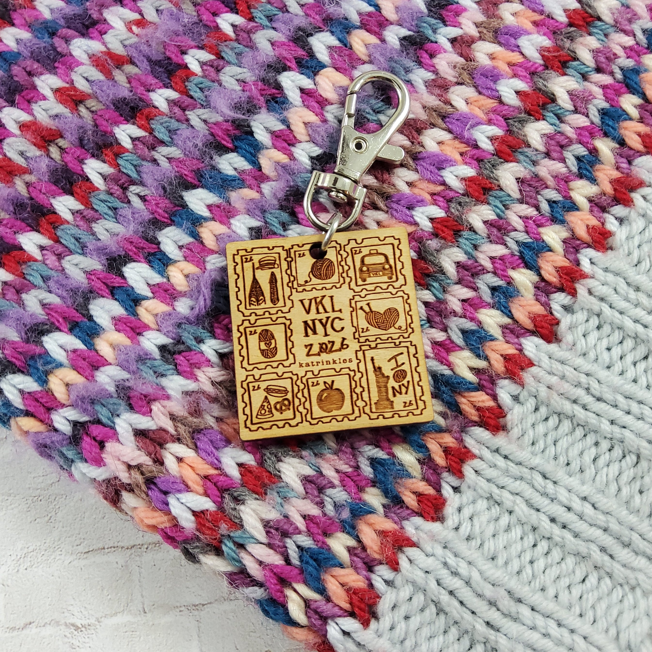 "Stamped" with a collection of adorable postage - knitting themed, of course! - this compact bag charm, which hooks easily onto project bags with a sturdy fob clip, is a cute and crafty momento of your time spent at Vogue Knitting Live.