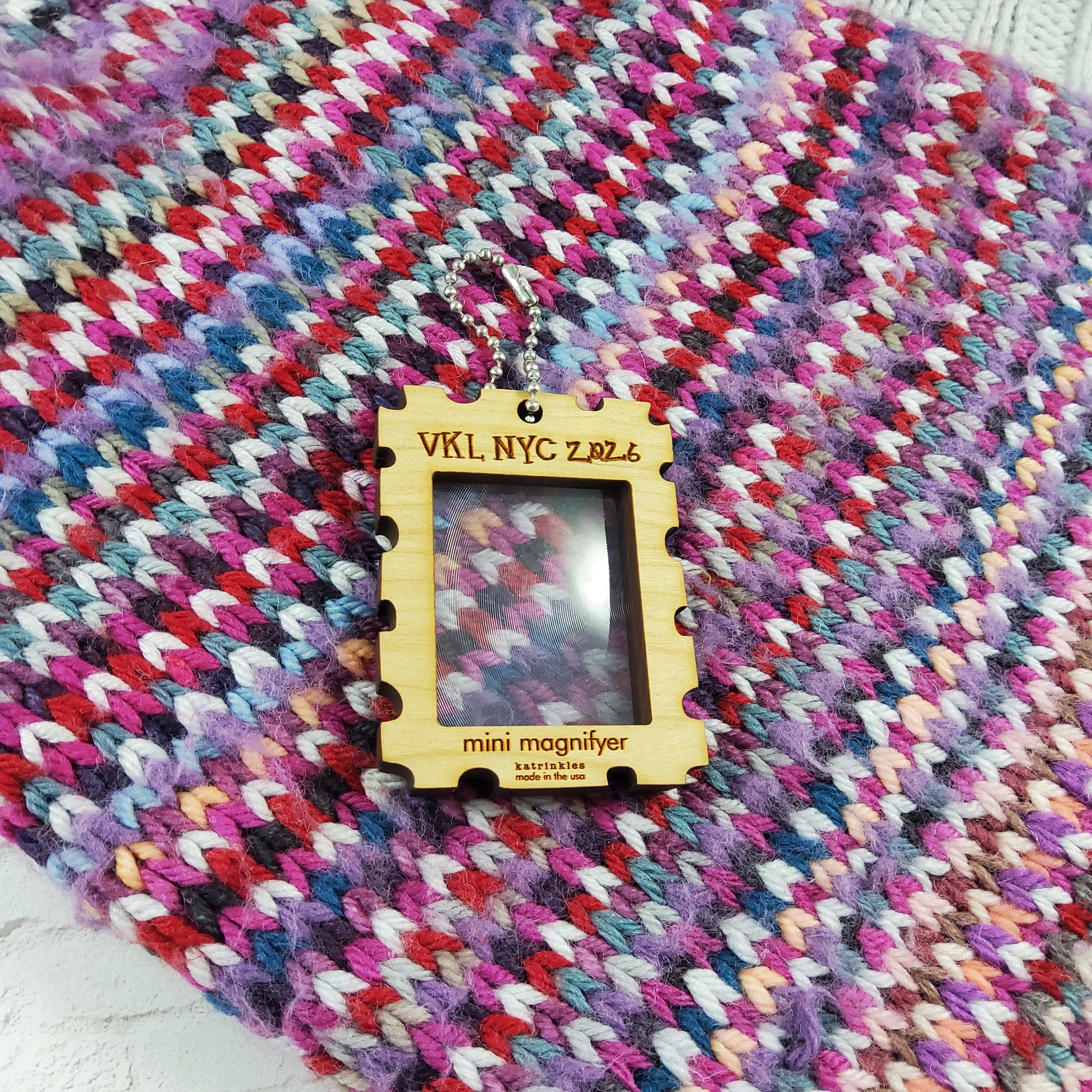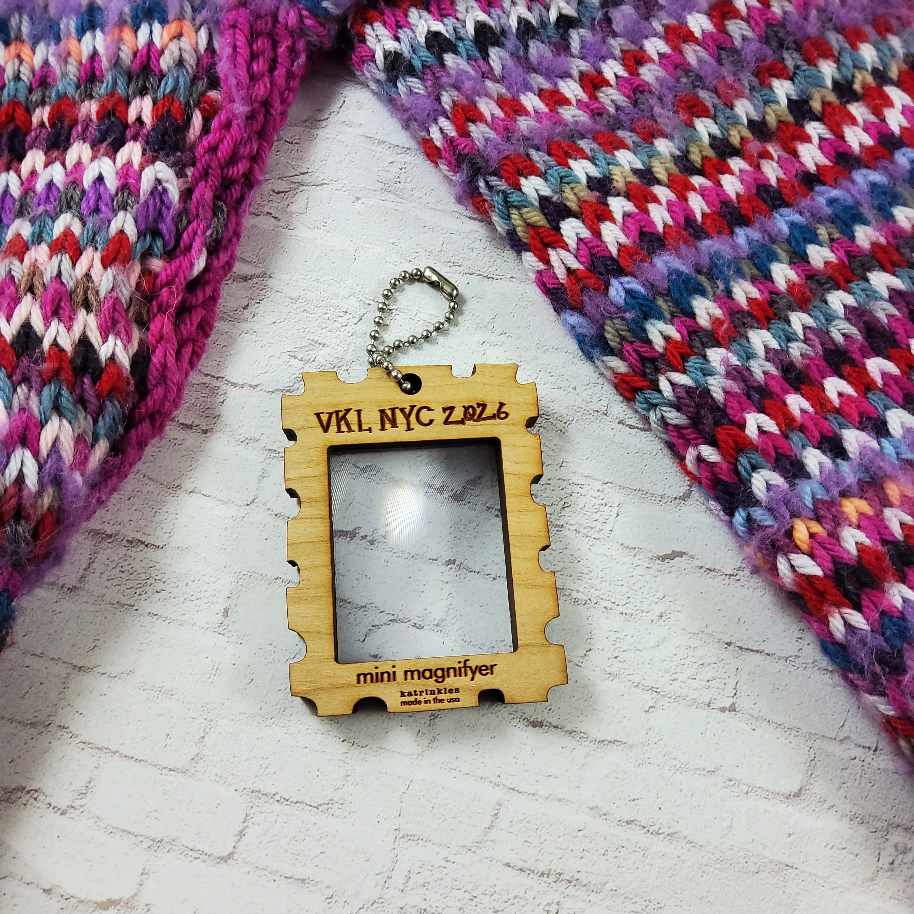 A smaller version of our popular pattern magnifyer made even more portable with a sturdy ball chain so you can hang it off of projects bags so it's always at hand. Styled like an oversized postage stamp, it doubles as a fun and eye-catching bag charm.